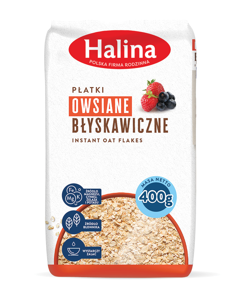 Płatki owsiane błyskawiczne Halina produkowane są z najwyższej jakości owsa. Charakterystyczny jest dla nich delikatny i naturalny smak. Płatki owsiane błyskawiczne – otrzymane są z pokrojonego ziarna, poddanego specjalnej obróbce hydrotermicznej. Są najmniejsze w kategorii płatków owsianych, nadają się do konsumpcji po zalaniu gorącym mlekiem lub wodą.